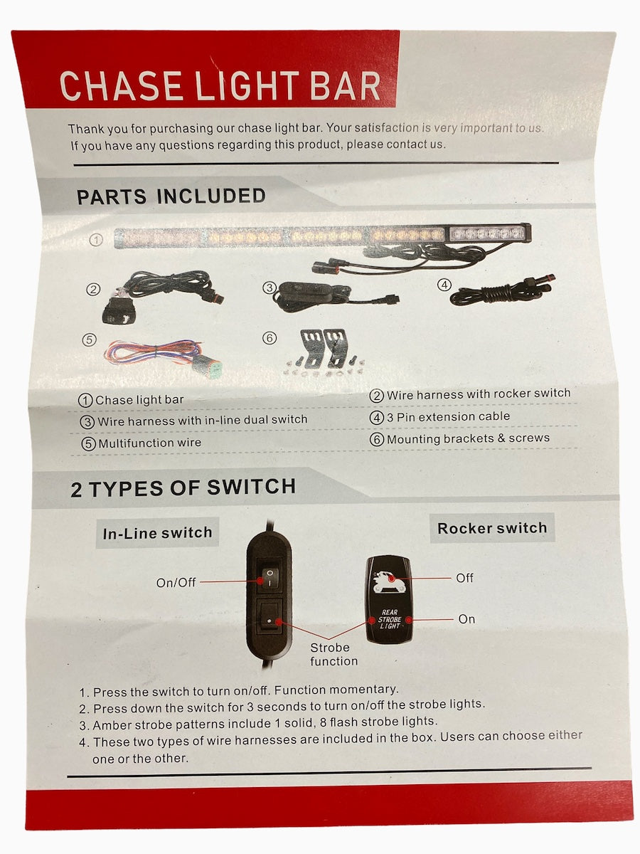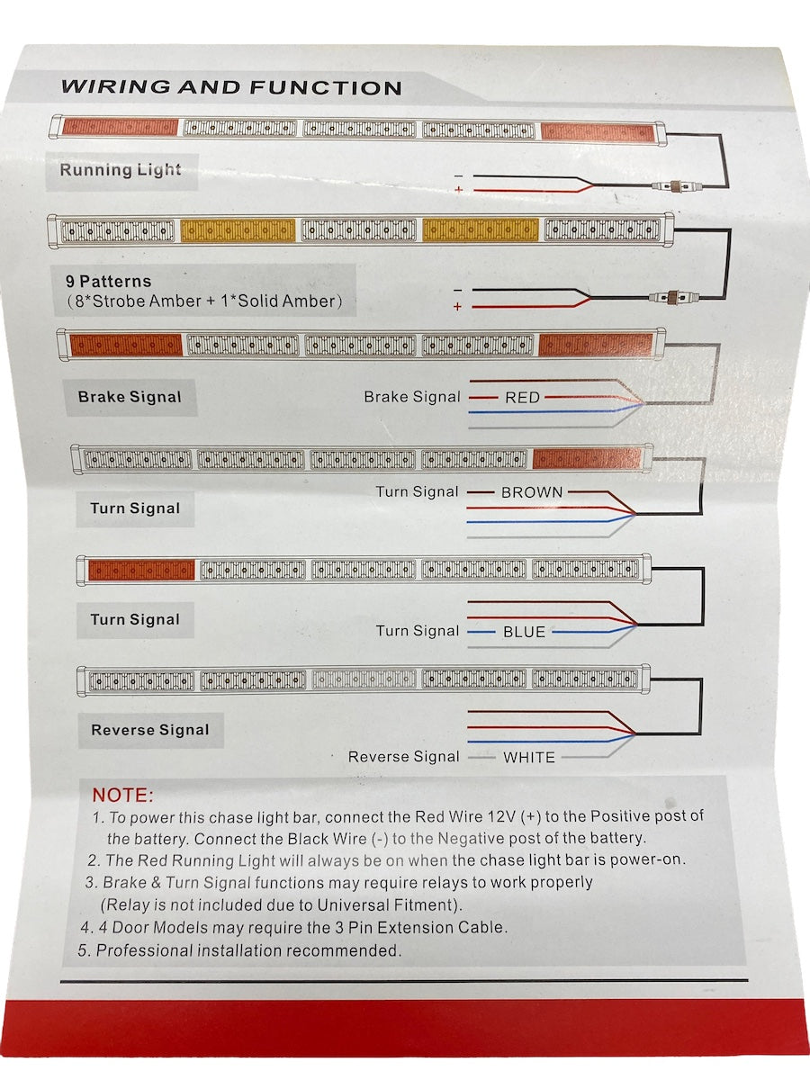 Super slim rear chase light bar with amber strobe, brake lights, running lights, reverse/white light, turn signals and full plug and play harness. Incredibly bright with high performance LED chips and 4D optical projectors.